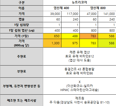 400 제품과 800 제품의 800μg 당 가격에 차이가 있으니